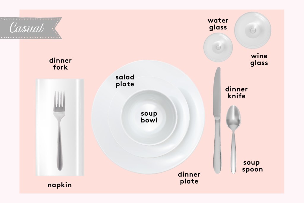A casual setting includes a single wineglass and a water goblet, and only three utensils. Pro tip: Glasses are set up on the right and knives should face in toward the plate.
