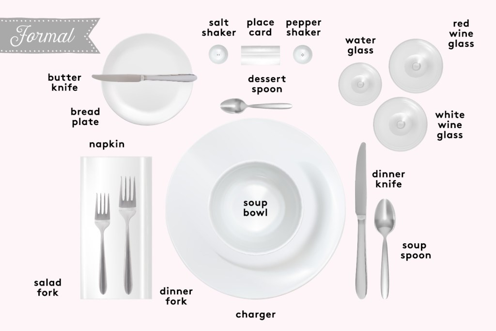 A formal setting is more comprehensive. This has both red and white wine glasses, a water goblet, flatware for each course, various plates, and a charger at each setting. Pro tip: Forks should be set in order of use, working from the outside in, and bread plate should be set up on the left.